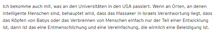 Der in Tel Aviv lebende israelische Autor Etkar Keret hat in einem Interview mit dem RBB darauf hingewiesen, dass es für ihn inakzeptabel ist, die Gräueltaten der Hamas so stark zu intellektualisieren, dass deren Brutalität quasi “wegerklärt” wird.