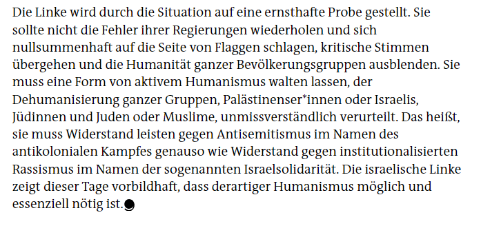 Gleichzeitig gäbe es aus linker Perspektive keinen Weg darum herum, eine Position politischer Trauer zu den Gräueltaten der Hamas zu entwickeln – selbst wenn diese von der politischen Rechten in Israel für die eigene militaristische Agenda genutzt werden könne – und auch wenn es einen seit Jahren innerisraelisch kritisierten, politischen Besatzungs- und Entrechtungskontext auf Seiten der Palästinenser gebe. Letzterer rechtfertige jedoch nicht die Massaker der Hamas in Israel:
