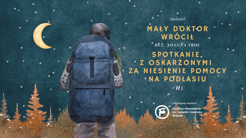 W imieniu osób represjonowanych, Kolektywu Szpila oraz Stowarzyszenia No To Ci Pomogę zapraszamy na monodram “Mały doktor wrócił” w reżyserii Joanny Troc, po którym odbędzie się dyskusja o bezprecedensowej sprawie Piątki, której grozi 5 lat więzienia za pomoc humanitarną udzieloną rodzinie uchodźczej na Podlasiu. Wyrok w tej sprawie może mieć wpływ na to, jak dalej będzie się kształtować przyszłość pomocy humanitarnej w Polsce.