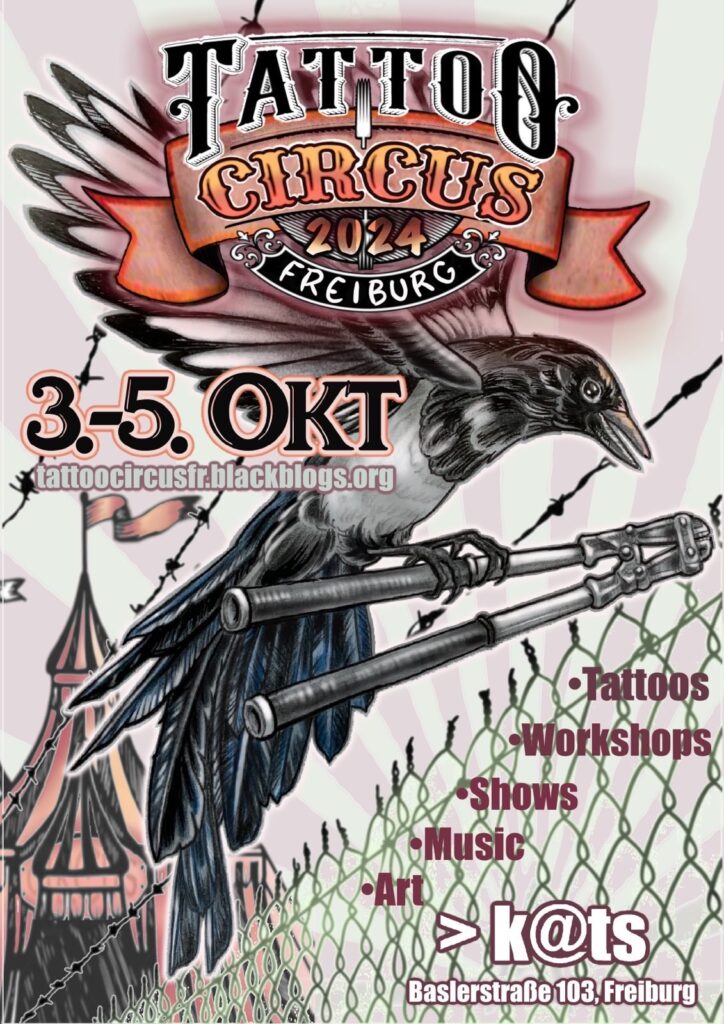 Im Oktober findet der erste Tattoo-Circus in der KTS Freiburg statt. Der Tattoo Circus ist eine politische und unkommerzielle Veranstaltung. Das Event macht auf das Thema Gefangenschaft, Knäste und Repression aufmerksam und sammelt Spenden, um Menschen zu unterstützen, die von Freiheitsentzug betroffen oder davon bedroht sind. Neben der Möglichkeit euch von Tattoo-Artists aus Freiburg und außerhalb tätowieren zu lassen, gibt es einige inhaltliche Veranstaltungen wie Diskussionen, Vorträge und Workshops rund um das Thema Knastkritik und Repression. Außerdem wird es ein tolles kulturelles Programm mit Musik, Konzerten und Shows, sowie eine Kunstausstellung geben. Verschiedene Kollektive werden uns mit leckerem Essen verwöhnen, damit wir genug Energie für alles haben.