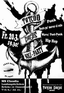 Tattoo Circus Solisause. Keine Anker dafür Drinks, Musik vom Plattenteller und Seeluft zum Solipreis! Punk, Hip Hop, 80s and more… Achtung, jede Stunde Dj* wechsel!