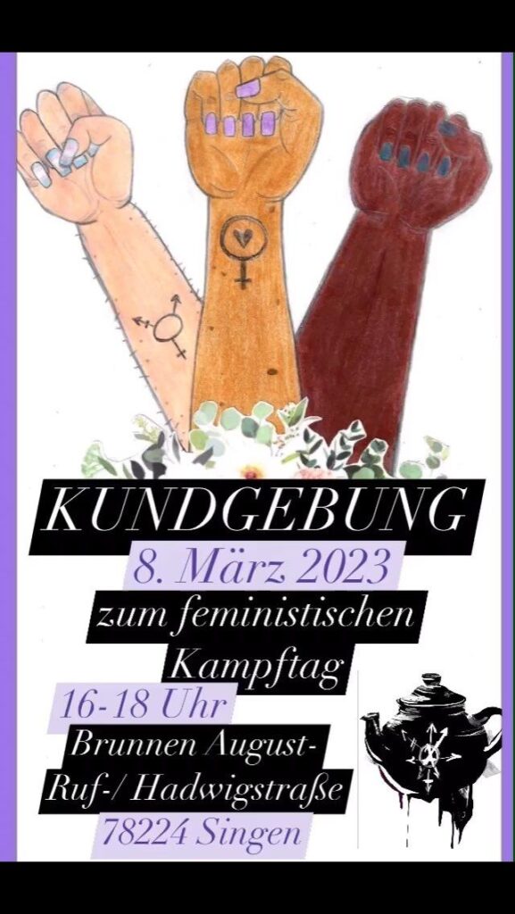 Wir laden zur Kundgebung anlässlich des Feministischen Kampftags an dem Brunnen (August-Ruf-/Hadwigstraße) in der Singener Innenstadt ein!