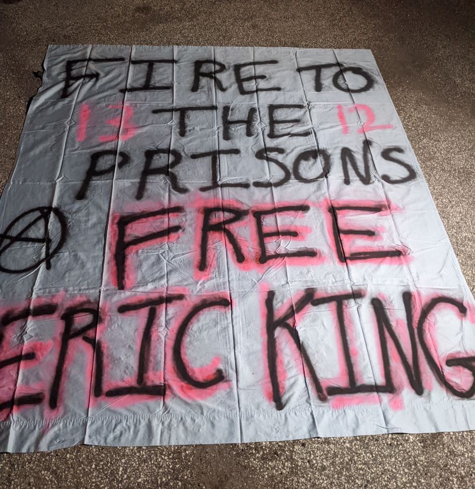 Anarchists in Orlando dropped a banner in solidarity with political prisoner Eric King, held captive by the state after attacking a Congress member’s office in solidarity with the Ferguson Uprising of 2014. King is serving out a 10-year sentence, and recently was found not guilty of assaulting a prison guard, which would have given him 20 years more.