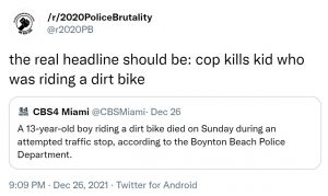 Many also suggested that police may have rammed or even ran over the boy instead. Indeed, it is difficult to believe that a 13-year-old could have died by simply falling off a dirt bike, and the press release makes it intentionally vague as to how exactly the bike “went down”.