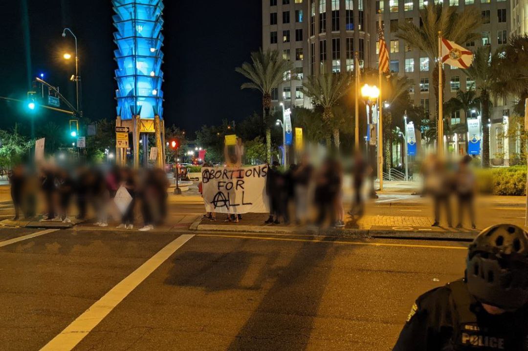 Hundreds of anarchists and allies of the movement for abortion rights took to the streets of downtown Orlando to protest the Supreme Court ruling on Roe v. Wade. Demonstrators destroyed several signs held by fascist anti-choice preachers, and were able to resist a later attempted cordoning off of the area by police.