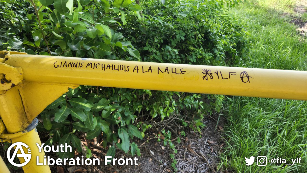 The Florida Youth Liberation Front stands in full solidarity with anarchist political prisoner Giannis Michailidis, whose hunger strike for freedom from indefinite imprisonment by the Greek state has now reached a milestone of 67 days. Our message to comrades in Greece and Michailidis himself: we stand in solidarity with the struggle for freedom in territories dominated by the Greek state, and will continue to act in solidarity with this liberatory movement.
