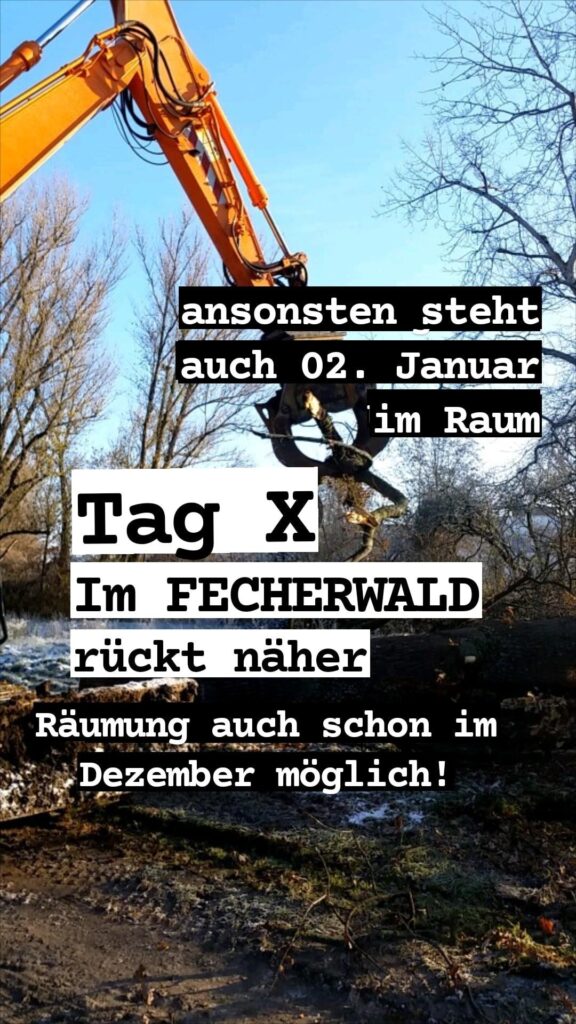 Bleibt also aufmerksam auf unseren Info- und Notfallticker (https://t.me/fecher_ticker). Wenn ihr die Räumung von innerhalb des Zaunes unterstützen wollt, seid rechtzeitig vor der Einzäunung drin und trefft uns in der Küche zum Pläne schmieden.