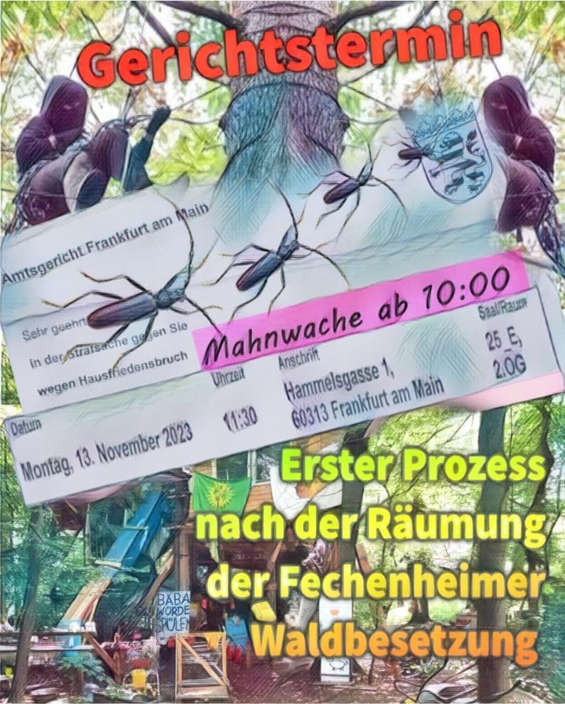 Nach der Räumung des Fechenheimer Waldes Anfang des Jahres steht nun der erste Gerichtsprozess an. Am Montag, dem 13.11. muss sich ein Aktivisti wegen des Vorwurfs des Hausfriedensbruchs vor dem Amtsgericht Frankfurt verteidigen. Wir laden zur kritischen Prozessbegleitung ein.