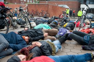 Wir wollen jetzt ein DIE-IN und eine Schweigeminute machen, als Aktion und Gedenken der Gefallenen im weltweiten Widerstand gegen die Herrschaft von Menschen über Menschen, von Menschen über Tier und Natur.“