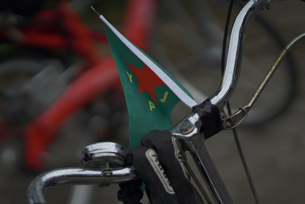 Die gelben und grünen Fahnen der Volksverteidigungseinheiten YPG und Frauenverteidigungseinheiten YPJ sehen wir auch hier. Im Kampf Haus um Haus holten sie die Stadt zurück.