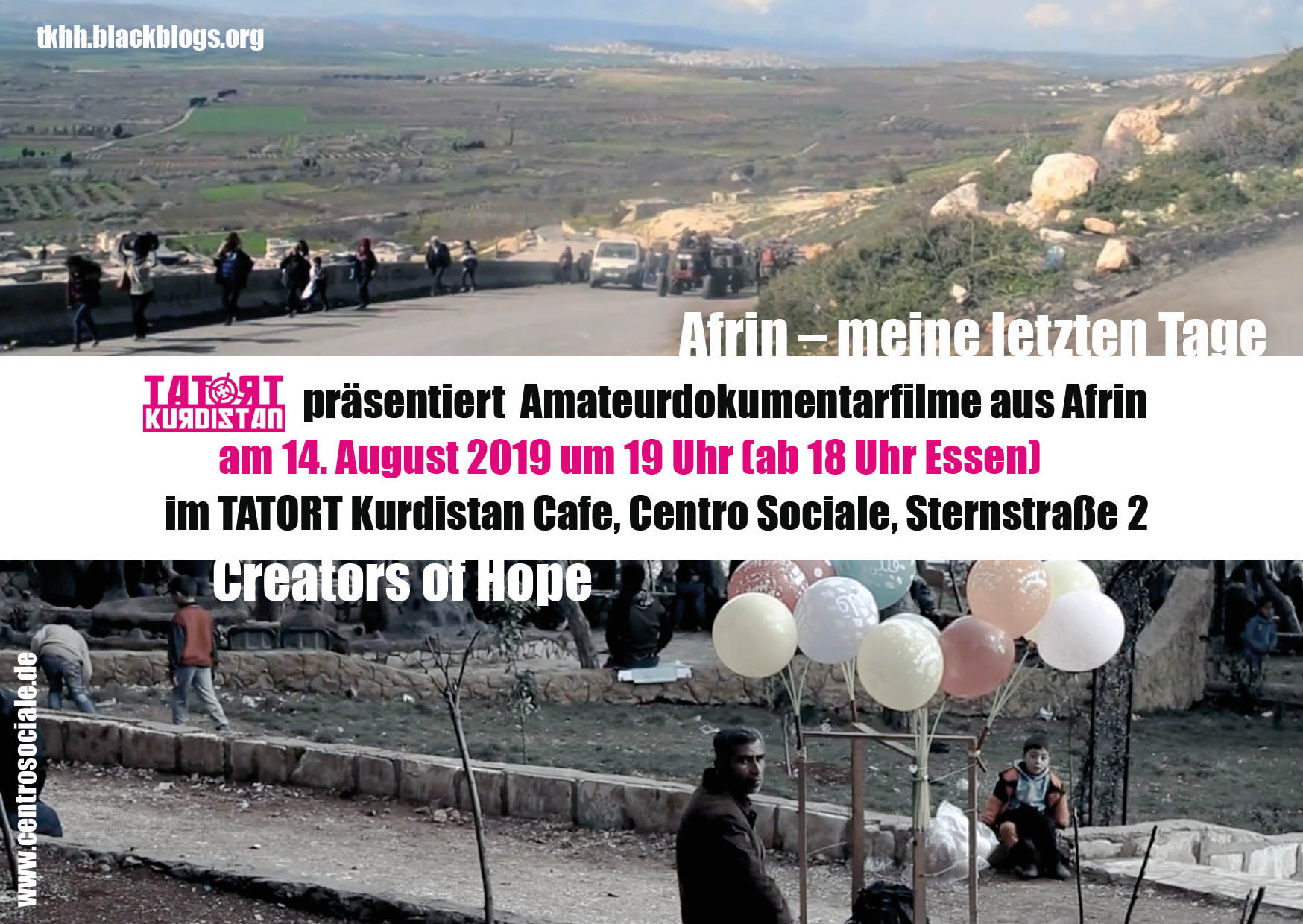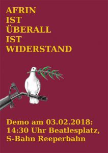 19.00 Uhr Veranstaltung „Überall ist Afrin- überall ist Widerstand“ von TATORT Kurdistan Centro Sociale, Sternstraße 2, U Bahn Feldstraße mit Vokü