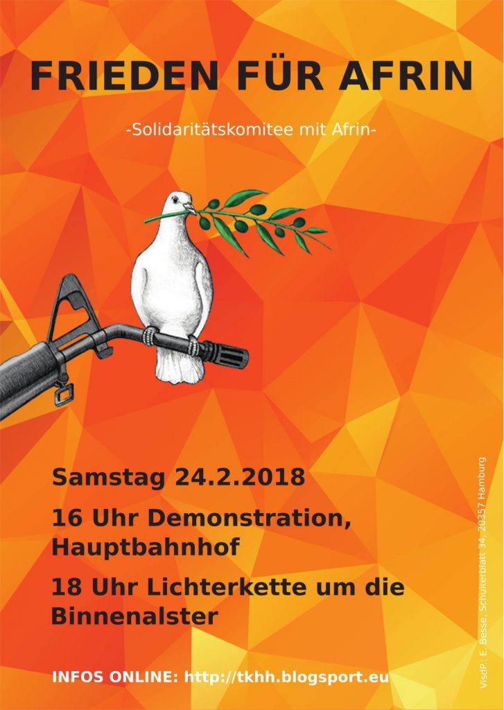 Seit dem 19.01. greift das türkische Militär mit Hilfe verbündeter islamistischer Gruppen, die Al Qaida nahestehen, Afrîn, eine überwiegend kurdisch bewohnte Region im Norden von Syrien, an. Der türkische Staatspräsident Erdoğan propagiert, die südliche Grenze der Türkei „von Terror säubern zu wollen“; tatsächlich jedoch gilt die Militäroffensive dem Projekt der Selbstverwaltung, das dort unter dem Namen „Demokratische Autonomie“ aufgebaut wurde. Seit 2013 schon kämpfen die Kurd*innen und ihre Verbündeten in Norden von Syrien unter großen Opfern gegen den sogenannten Islamischen Staat . Continue reading Afrîn | Anstehende Aktionen