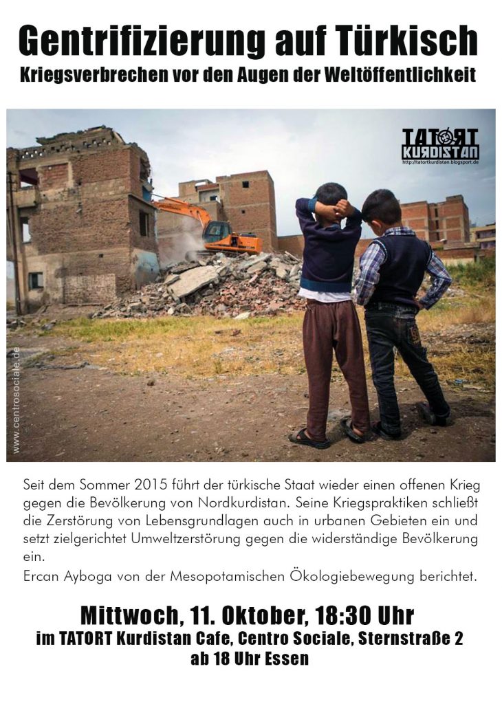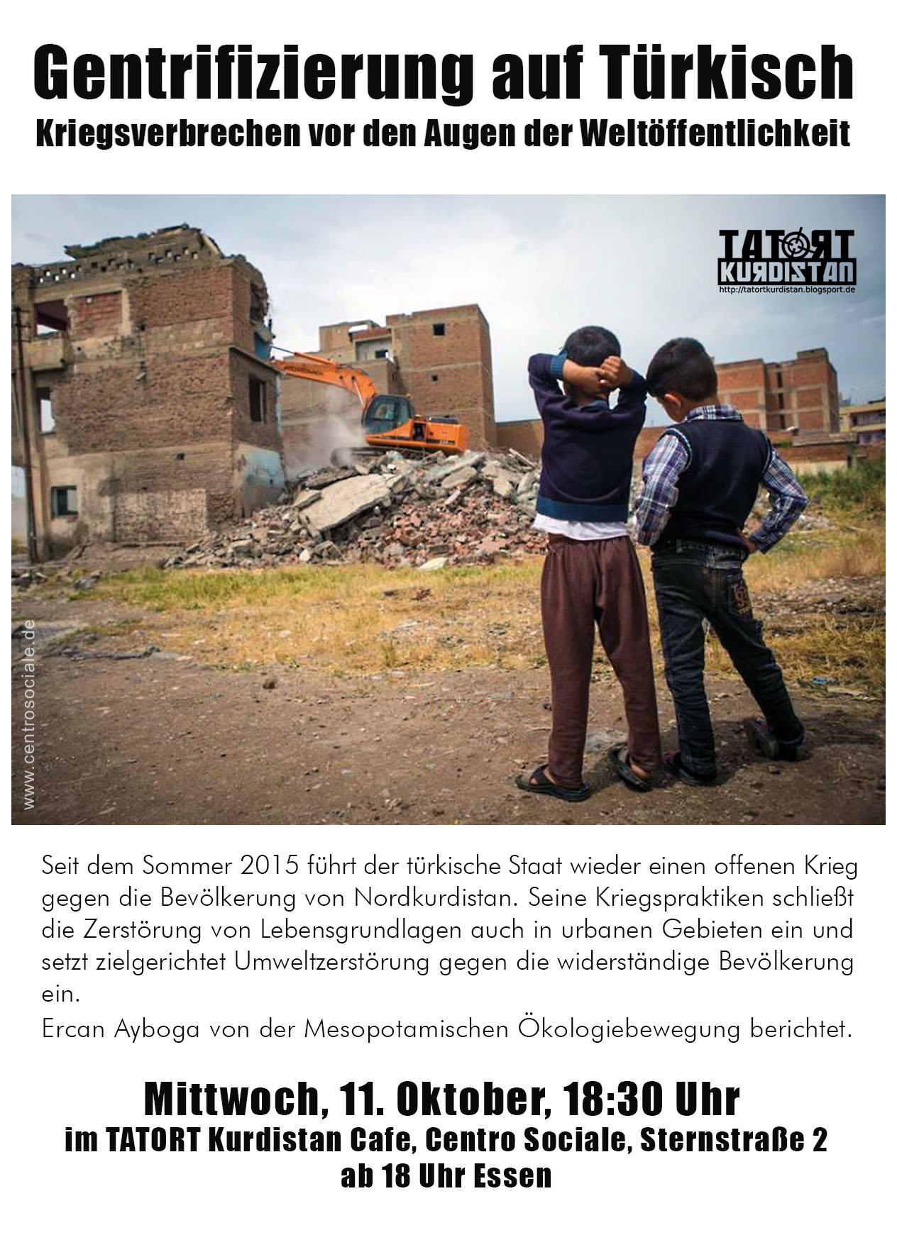 Seit dem Sommer 2015 führt der türkische Staat wieder einen offenen Krieg gegen die Bevölkerung von Nordkurdistan. Seine Kriegspraktiken schließt die Zerstörung von Lebensgrundlagen auch in urbanen Gebieten ein und setzt zielgerichtet Umweltzerstörung gegen die widerständige Bevölkerung ein. Continue reading 11.10.17 |TATORT Kurdistan Café im Oktober | Gentrifizierung auf Türkisch