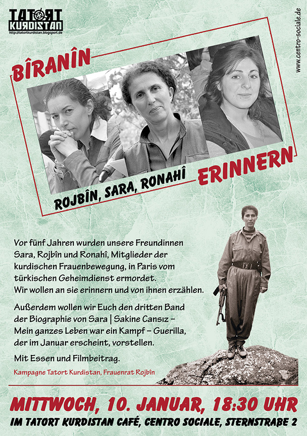 Wir wollen von den drei wichtigen Persönlichkeiten der kurdischen Frauenbewegung erzählen. Außerdem stellen wir euch den gerade erschienenen dritten Band – Guerilla – der Biographie von Sakine Cansız „Mein ganzes Leben war ein Kampf“ vor. Mit Essen und Filmbeitrag.