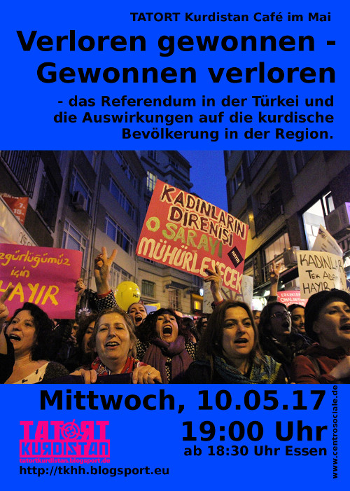 Erste konkrete Auswirkungen sind weitere Inhaftierungen, das In-Aussicht-Stellen der Wiedereinführung der Todesstrafe und – bisher ein Novum – direkte Luftangriffe auf Strukturen der kurdischen Selbstverteidigung in Şengal/Nordirak und Rojava/Nordsyrien, sowie der Einmarsch mit Bodentruppen in die Gebiete der Demokratischen Konföderation Nordsyrien. Continue reading 10. Mai: Verloren gewonnen – Gewonnen verloren – das Referendum in der Türkei | TATORT Kurdistan Café