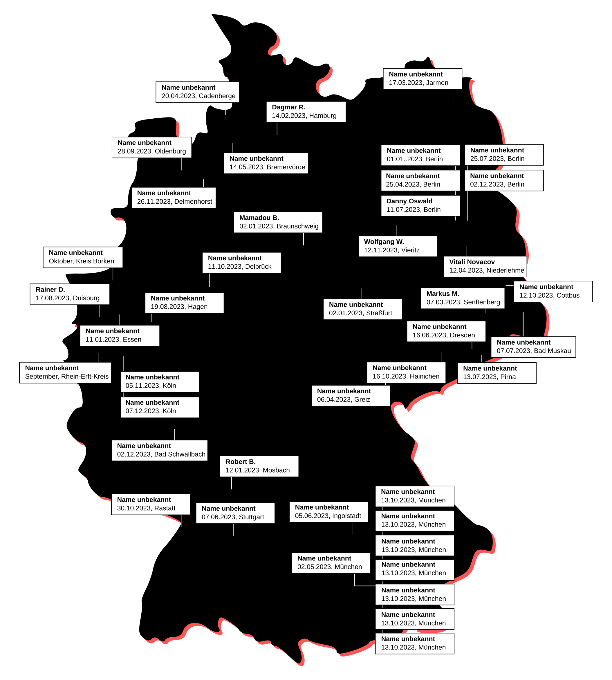 In den Informationen zu den Todesfällen fallen außerdem immer wieder Diskriminierungsmuster und gesellschaftliche Machtverhältnisse wie Rassismus, Armut, Ableismus und die Benachteiligung von Menschen in psychischen Ausnahmesituationen sowie von wohnungslosen Menschen oder Gewalt gegen Frauen auf. Die Funde lassen uns nicht los, auch wenn wir unseren fehlenden persönlichen Bezug zu den Betroffenen und Opfern stetig kritisch hinterfragen. Wir verstehen unsere Recherche als Beitrag zu einer informierten und kritischen Diskussion über polizeiliches Handeln.