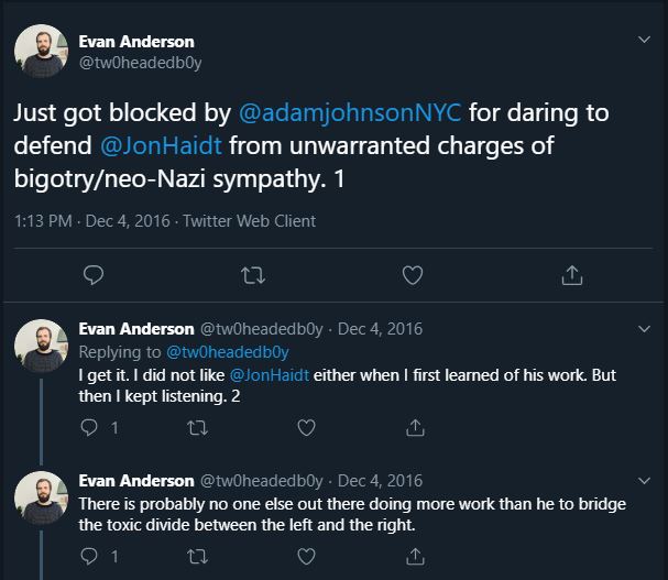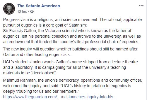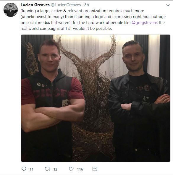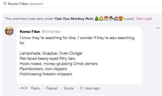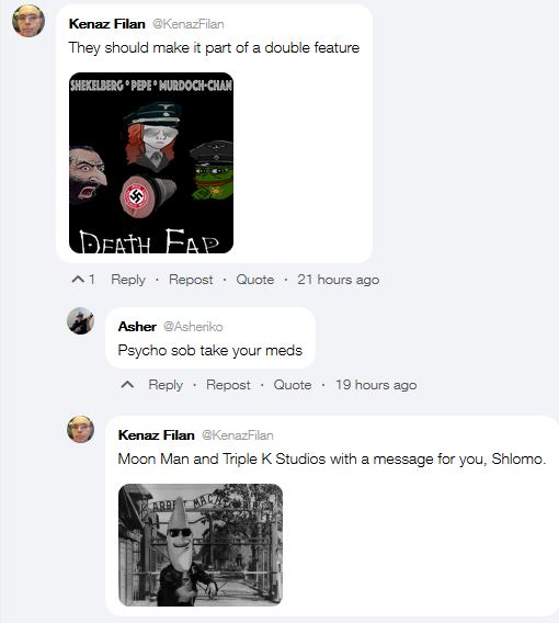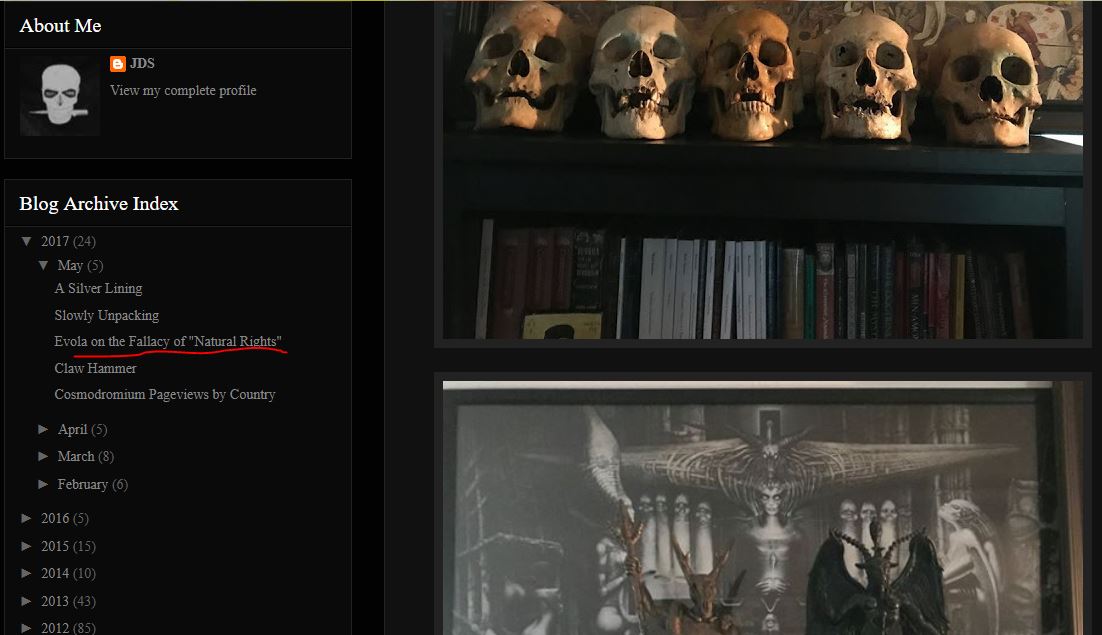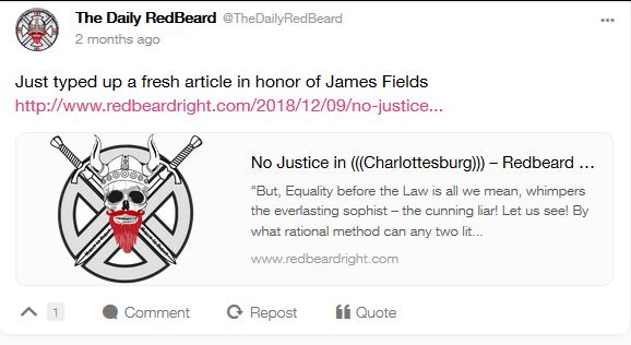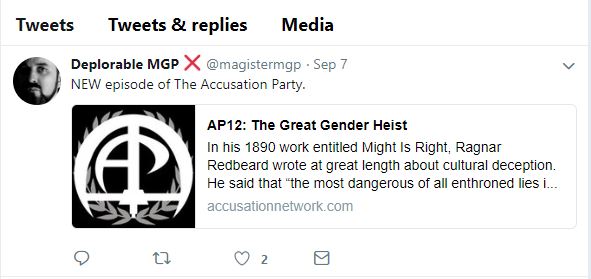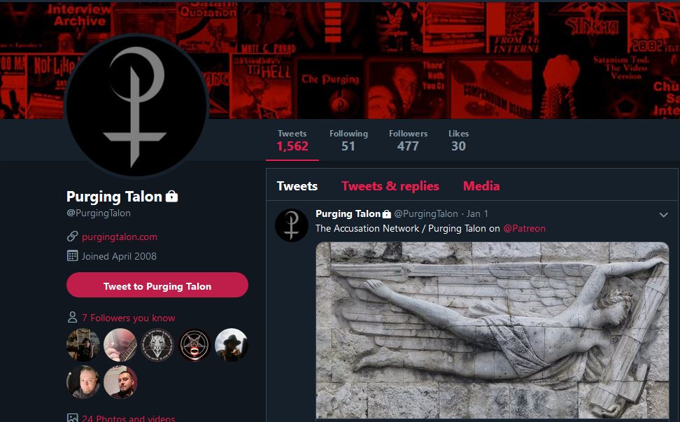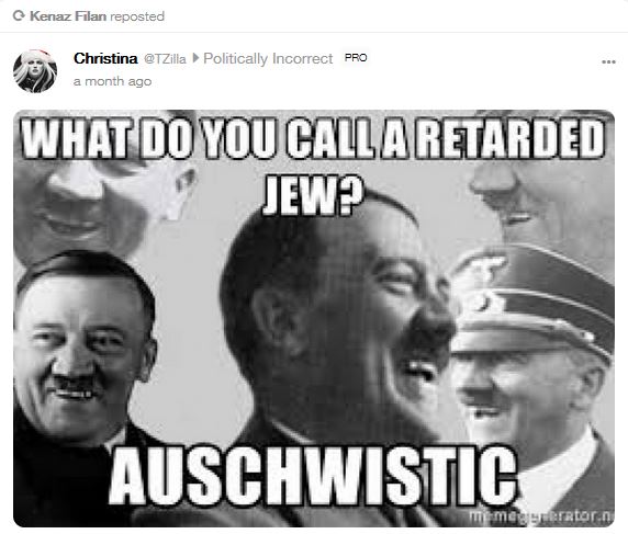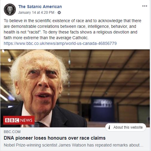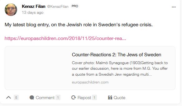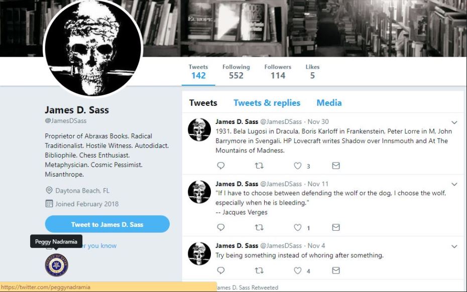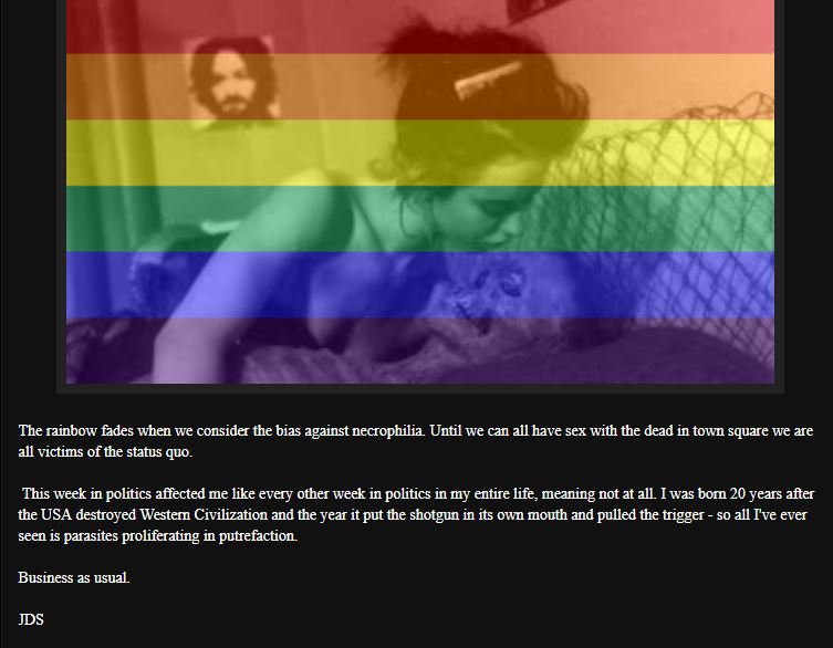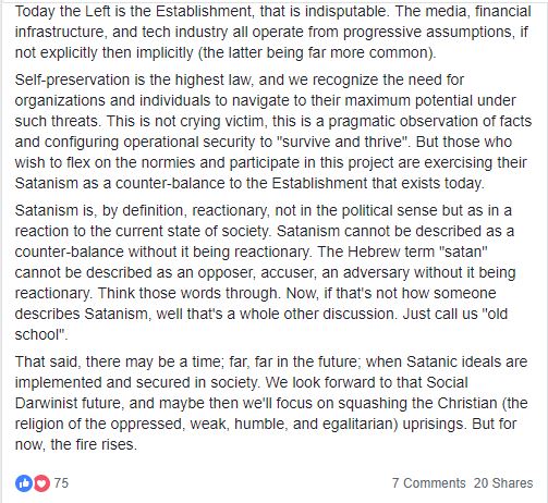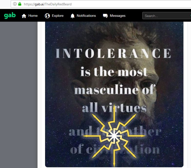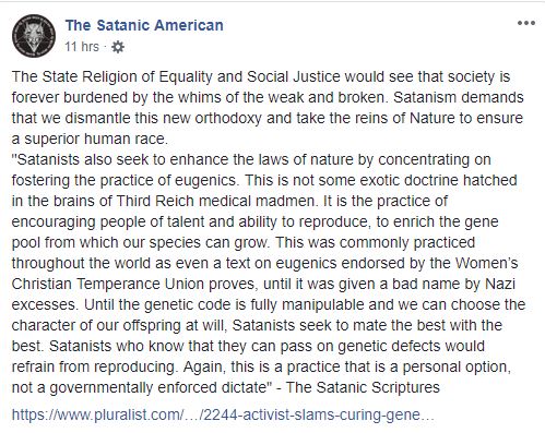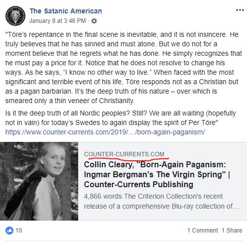 Secondly, she keeps company with fascists and she links to blog posts from them; specifically, she’s friends with outright nazi Church of Satan member Kenaz Filan and she’s advocated and platformed his blog Europa’s Children, wherein he can be seen making bad faith arguments and furthering fascist talking points for an ethnostate and white nationalism. Kenaz, by the way, is an explicit nazi who furthers the conspiracy theory that James Alex Fields Jr. ran over a crowd at the deadly Unite the Right rally in self-defense and is innocent of committing murder. Kenaz interacts with other fascists on his Gab, like Daniel McMahon AKA Jack Corbin, and his Gab posts include inciting violence and spreading around literal anti-Semitic propaganda from nazi Germany. He’s also harassed a vulnerable person on Twitter in the aim of getting them to kill themselves. Galina apparently has no problem with this bigoted behavior and she seems to hold Kenaz in high regard.