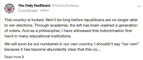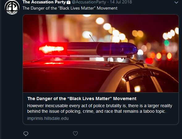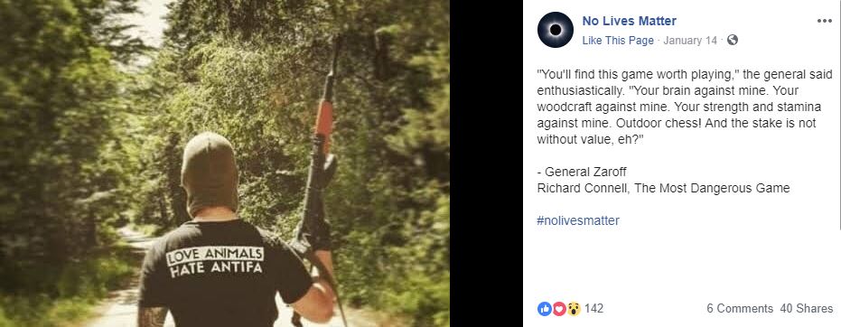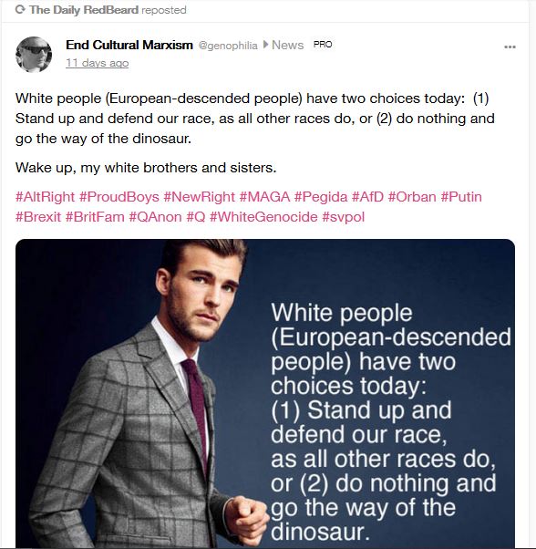 Here she is sharing content by Kenaz Filan consisting of dishonesty and bad faith arguments. Any claim that Kenaz makes about “not being a nazi” or his “white nationalism not involving hate or violence” is directly destroyed by taking a look at his Gab account where he glorifies killing black people, shares racist and anti-Semitic memes, and chats with other fascists. As well, Galina seems to have no problem whatsoever with now-defunct fascist hate group Identity Evropa, now rebranded as American Identity Movement. She thinks that it’s not a big deal that white supremacists appropriate religious movements such as heathenism or that they follow a strict code of traditionalism that discriminates and commits violence against marginalized groups and people. She’s also completely fine with white supremacists being in law enforcement.