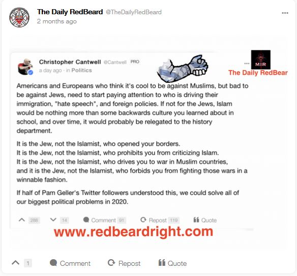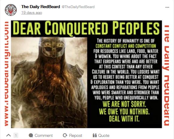 She’s shared propaganda from alt-right site Breitbart, which has featured Milo “Gay Hitler” Yiannopoulos. She’s Islamophobic, and it’s worth pointing out that Heathens United Against Racism has made a statement against here for this and promoting Hindu nationalist publications promoting all-out war with Muslims. They’ve denounced her and called for opposition against her.