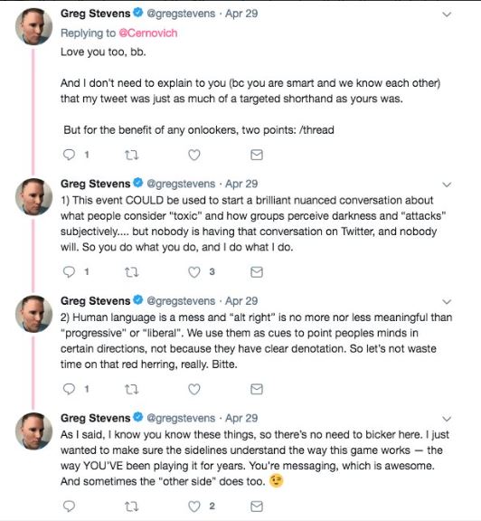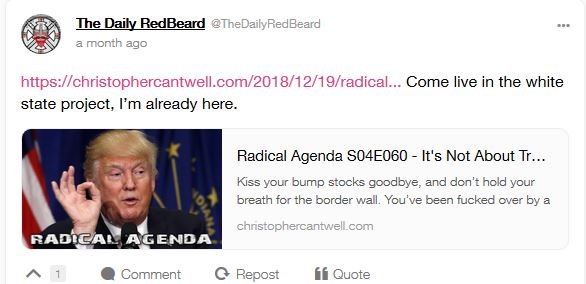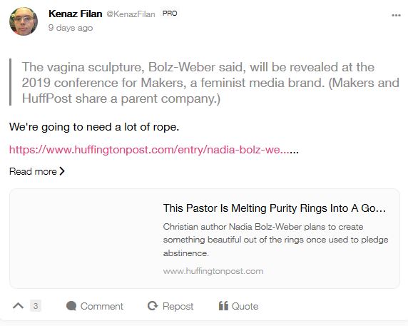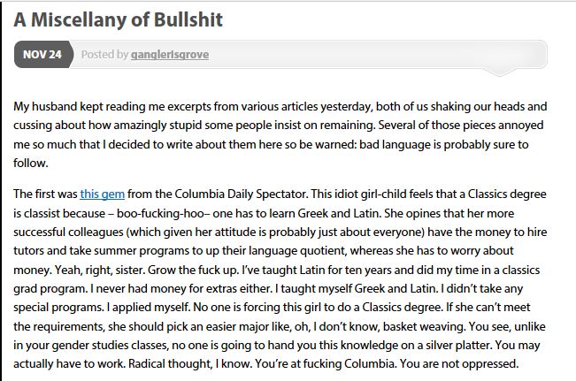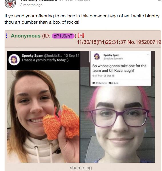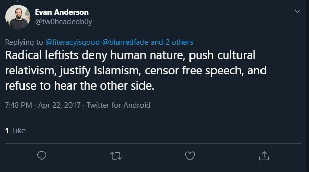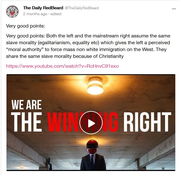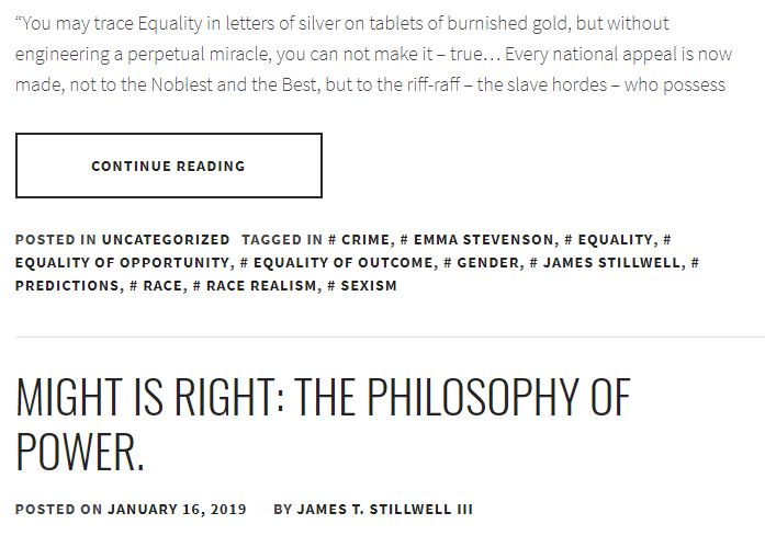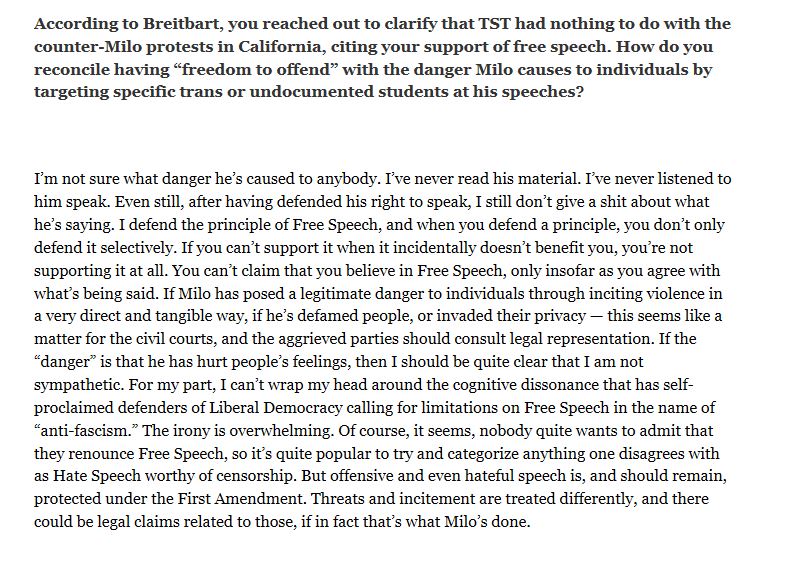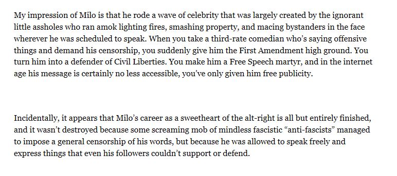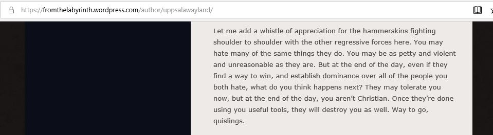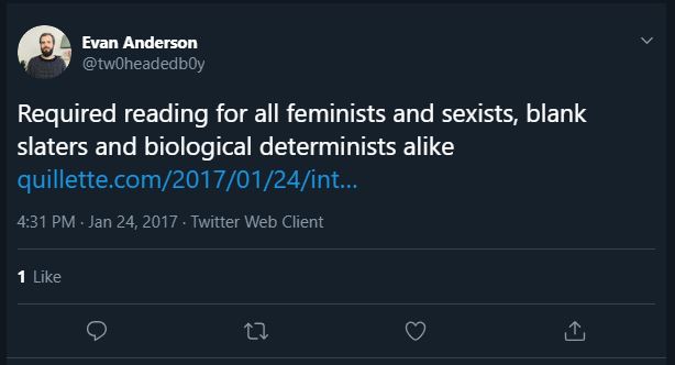 Unsurprisingy, she’s also anti-PC and anti-SJW, anti-“censorship”, and pro-free speech that includes platforming fascists. She’s linked to some articles by Wayland Skallagrimsson who has talked fondly of the hammerskins and espoused proto-fascist ideas of hierarchy and anti-PC/anti-SJW sentiment.