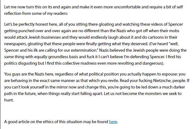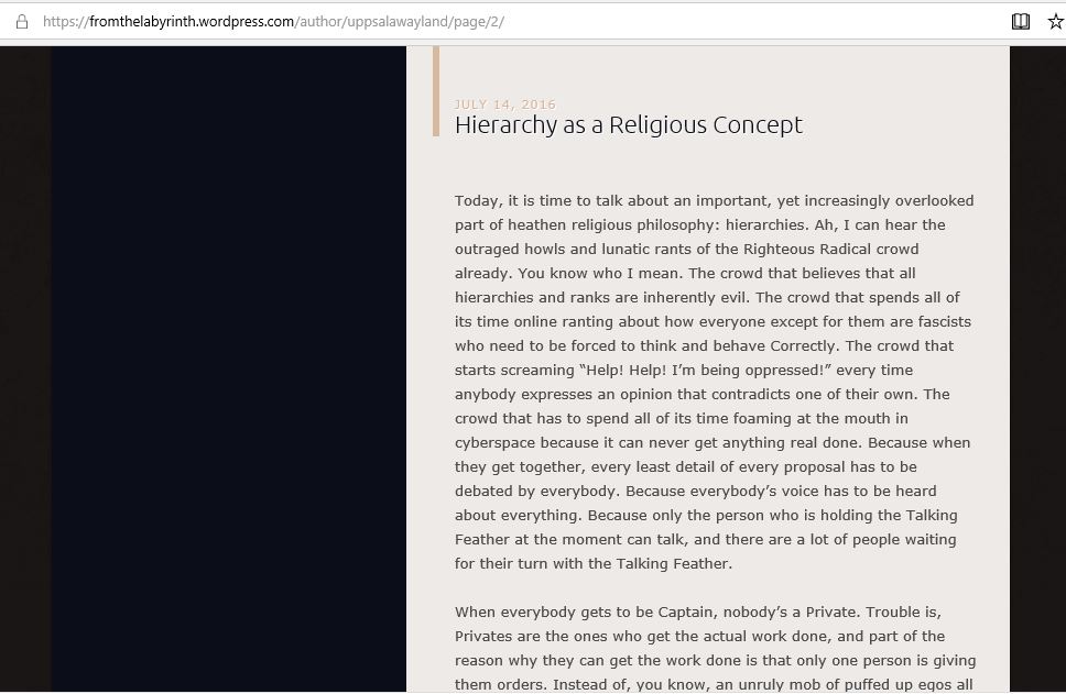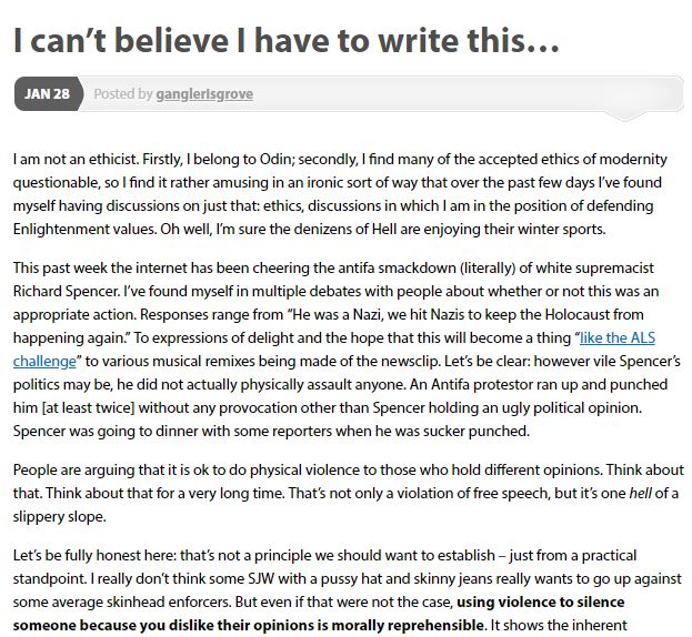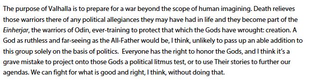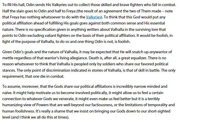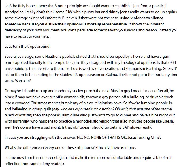 In a few posts on Galina’s blog, she attempts to paint herself as not being a nazi and holding to the position that nazism is harmful, but she contradicts herself all over the place stating that she’s anti-antifa and that fascists like Richard Spencer shouldn’t be punched in the face. In a few places, she even states that she falls along the center of the political spectrum and puts forth tired “both sides” talking points. She immediately contradicts this, though, by going on with anti-antifa and pro-free speech tirades that sympathize with violent fascists and play into their favor by supporting them having a platform from which to hurl speech that targets marginalized people with violence and murder. She’s quick to condemn antifascist tactics that thwart this behavior but she’s even quicker to sympathize and excuse violent fascists. She even made a blog post that stated she thinks that nazis are and should be welcome in Valhalla because Odin is a deity of such a mind that politics and irredeemable behavior are just such a small thing to worry about, that actions in battle are what should truly decide the inhabitants of Valhalla. The whole thing stinks of nazi apologism.