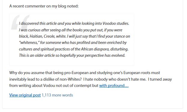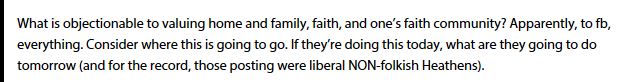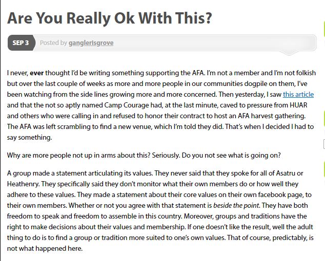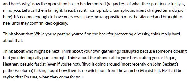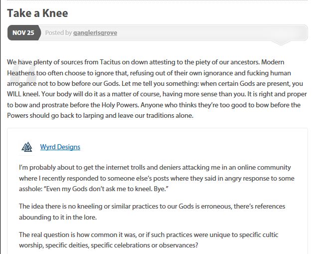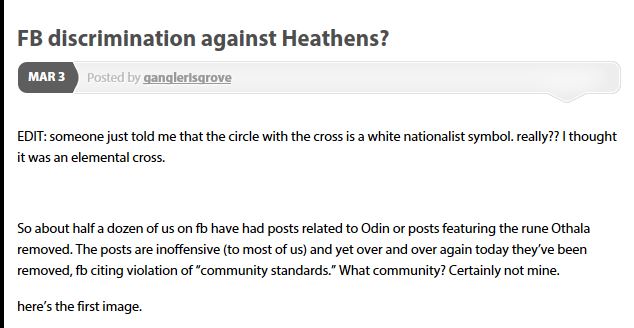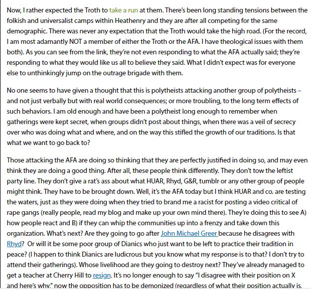 She’s also made a post that supports the white supremacist Asatru Folk Assembly, and she is in opposition to Declaration 127 which lists heathen and pagan organizations that oppose AFA. She can be seen actively supporting this racist organization. She’s also condemned the organization Troth for coming out as anti-racist. One isn’t in a position to claim to be opposed to fascism if one directly supports fascist organizations and condemns those who oppose them. She’s entirely making way for fascism to continue to creep into these religious circles. As we’ve seen many times with other fascist sympathizers, she’s pulling the plausible deniability card. It’s not going to cut it around here. There is no middle ground. Either one is and supports fascists or one isn’t and doesn’t. She’s going beyond being merely complicit here. She’s endorsing a fascist heathen organization, something that should be given no tolerance.