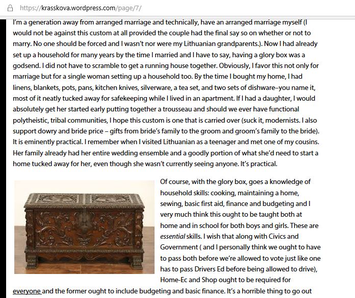 As well as being anti-SJW, she’s also intolerant of other religions. She wants nothing to do with them and holds an elitist view of her religion in looking down upon others. She wants to mate only within the religion and she supports patriarchial conceptions of a dowry and arranged marriages. She also has troubling ideas about duty to art. She’s fatphobic and she’s against “progress” if it stands in the way of her gods or religion. She’s also classist and she doesn’t believe in helping poor people gain access to college, being a self-described gatekeeper.