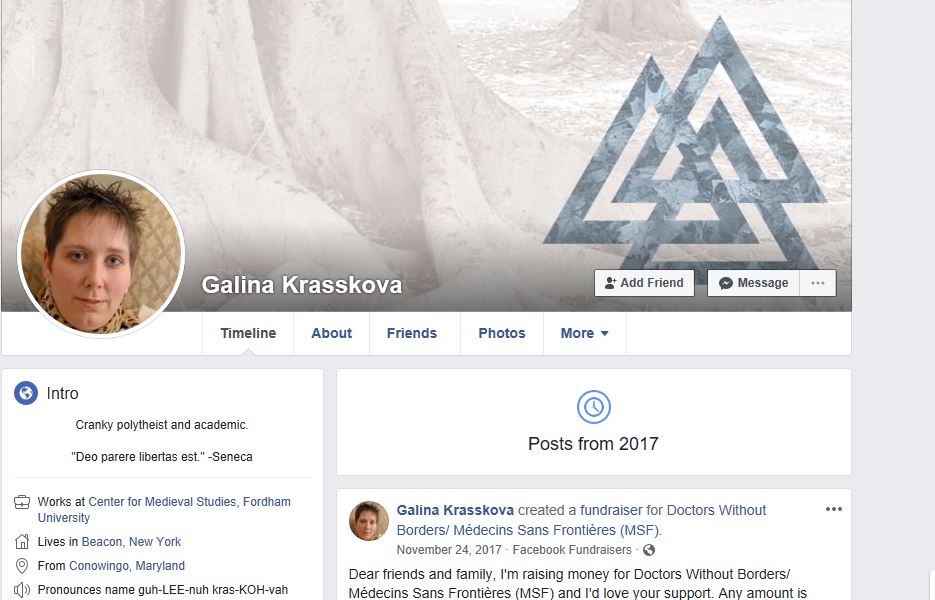 Meet polytheist author, fascist sympathizer, and rape apologist Galina Krasskova. She’s authored quite a number of books dealing with polytheism, Nordic gods, and working with runes. Evidently, she’s a “big name pagan” author (although, by her own account, she prefers the label polytheist), and one can find all kinds of conversations about her via online forums and sites like Tumblr. She’s quite an academic, holding a BA in cultural studies with a concentration in religious studies from Empire State College, a masters in religious studies from New York University, has completed Ph.D. coursework in classics at Fordham University in New York, and she’s currently pursuing a medieval studies MA. Her aim in academia is to attain a Ph.D. in theology.
