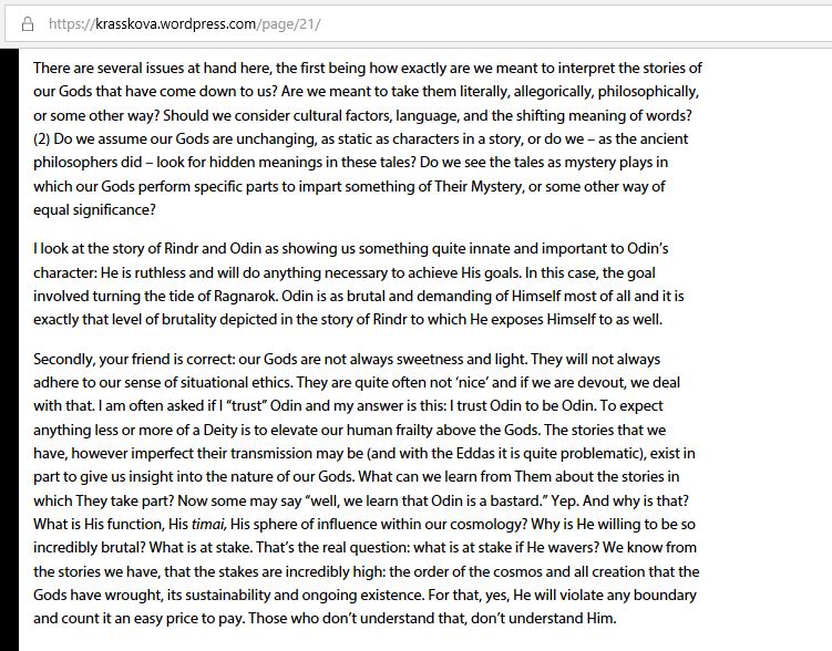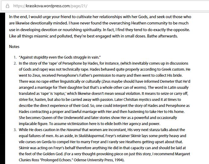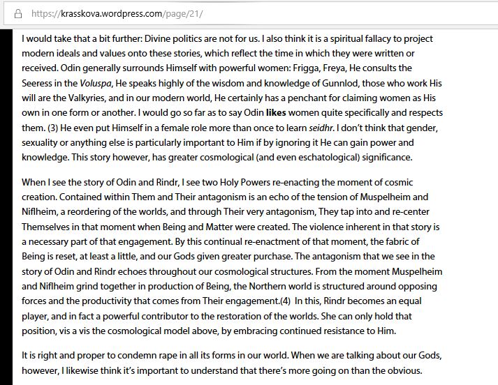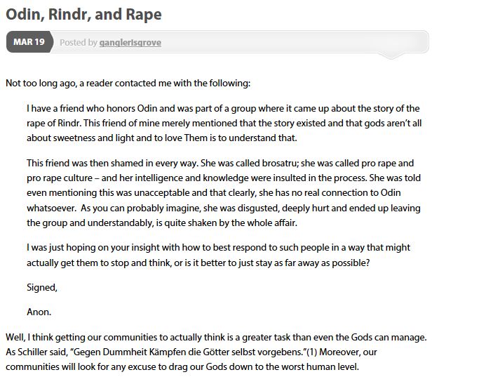 Thirdly, Galina is a rape apologist who has justified the rape of Rindr in her mythology at the hands of Odin and has basically excused any atrocity by, or in the name of, her gods. This apologetic is reminiscent of frequent Christian apologetics that justifies atrocities by Jahweh by invoking his mysteriousness and omnibenevolence (something that Galina does on her blog in regard to her gods)–that we couldn’t possibly be in a capacity to understand his plan with our limited minds and logic, and that all apparent evil in the world ultimately serves a higher purpose in perhaps teaching a valuable lesson. And this, to be sure, is an example of the danger and utter moral failing of religion.