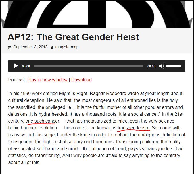 Galina has also worked with and supports a transphobic transgender intersex person, Raven Kaldera, who has also published books about paganism. In the past, Raven has spouted all sorts of transmisogyny, anti-trans violence, and racism. For instance, Raven has called trans issues “third gender issues”, which is problematic in itself, and it seems he also doesn’t accept trans people as the gender that they are. Raven also has misconceptions about what male privilege is, saying that male privilege is discounted both when one encounters dirty looks in a clothes store or that one isn’t allowed to hold a traditionally “female” job. Generally, he seems to have a bigoted and ignorant view of trans people.