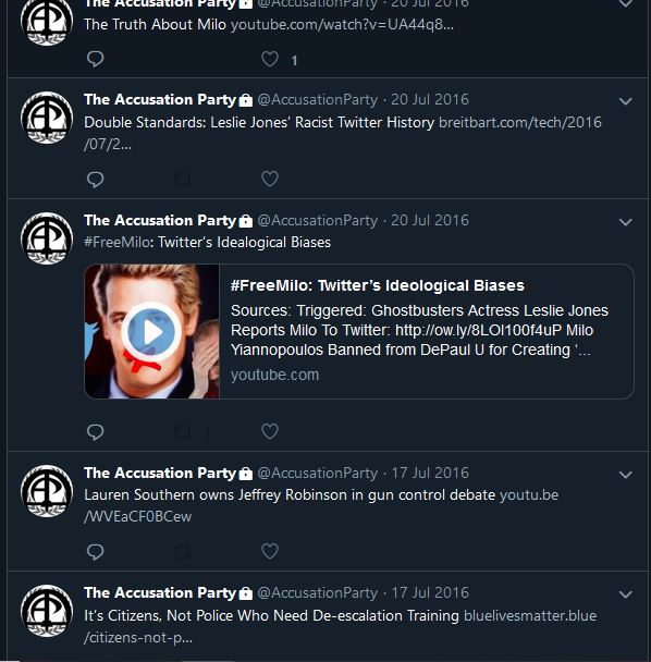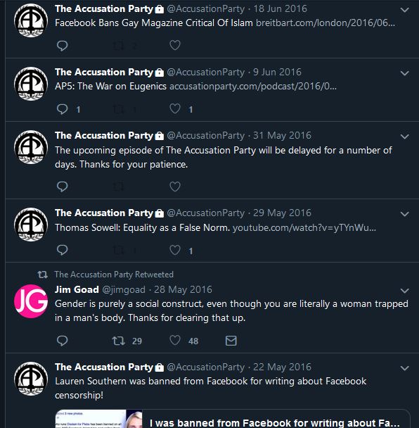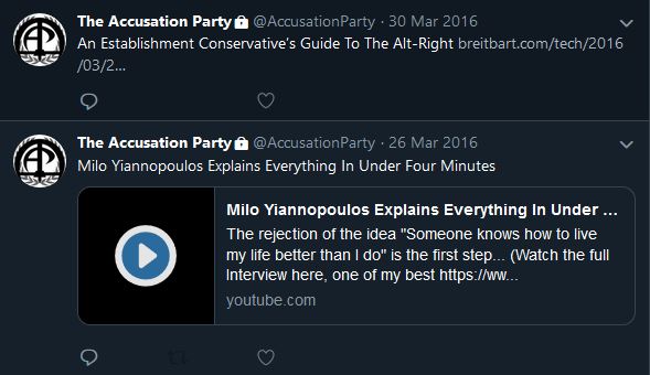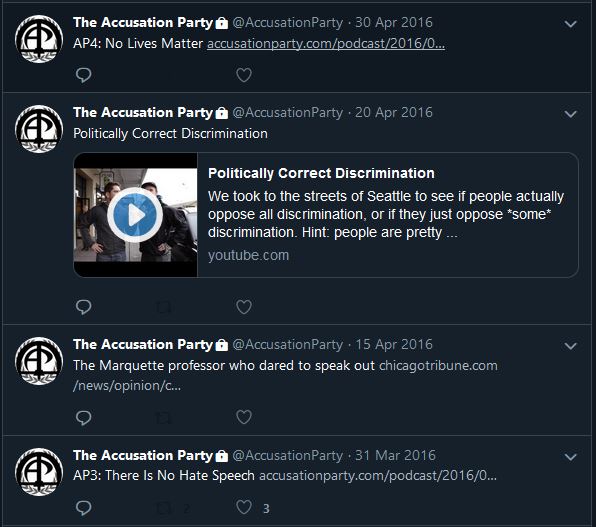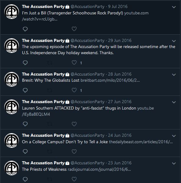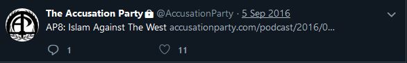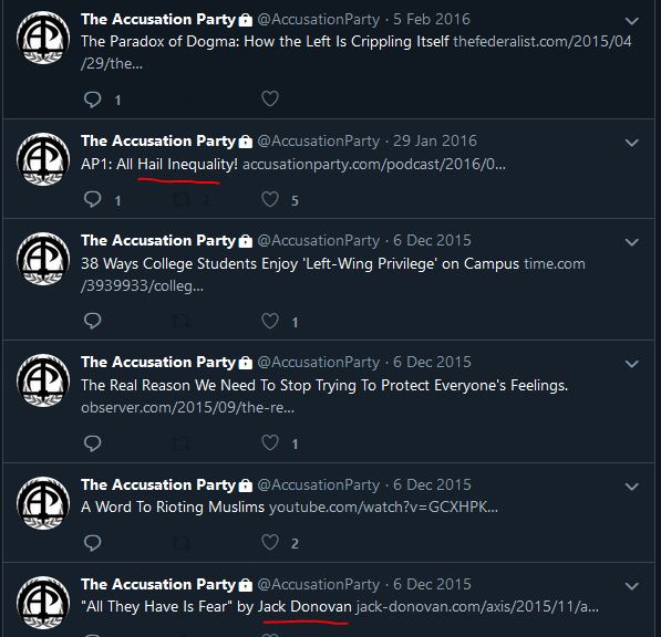 In taking a look at the Accusation Party podcast, we can directly see references to fascism on TAP’s Gab and Twitter accounts, which sport a Romanesque statue and the fasces, a central symbol of fascism.