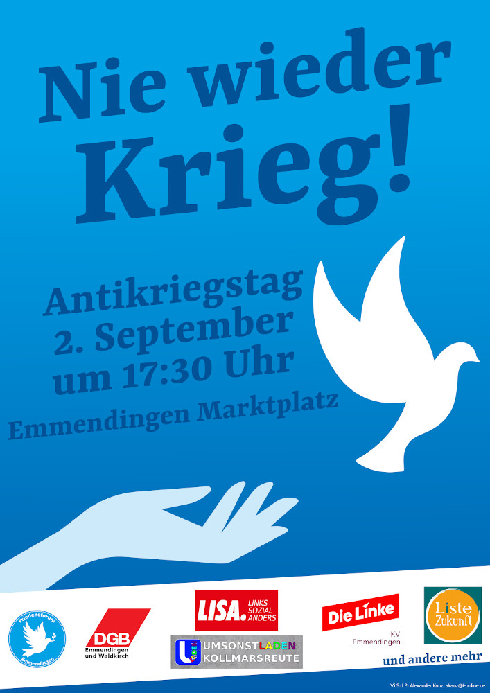 Alex Kauz vom Landesvorstand der Linken ist zu Beginn der Sommerferien auf das Friedensforum zugekommen mit der Idee dieses Jahr zusammen mit dem DGB Kreisverband in Emmendingen eine eigene Veranstaltung zu organisieren. Aufgrund der Sommerferien und der Urlaubszeit ist die Unterstützerinnenliste kleiner und viele Gruppierungen wurden aufgrund der Sommerpause gar nicht erst angefragt. Daher wundern Sie sich bitte nicht wenn Sie/Ihr heute zum ersten Mal von der Veranstaltung hören. Trotzdem hoffen wir auf rege Teilnahme. Die Veranstaltung wird statt der monatlichen Freitagsmahnwache des Friedensforums durchgeführt und wir vom Friedensforum Emmendingen laden herzlich alle zur Teilnahme ein. Gerade in diesen Zeiten wo Kriege immer selbstverständlicher als Mittel zur Durchsetzung der eigenen Interessen Schule machen, wird es umso wichtiger in aller Deutlichkeit für Frieden einzustehen auch hier in Emmendingen.