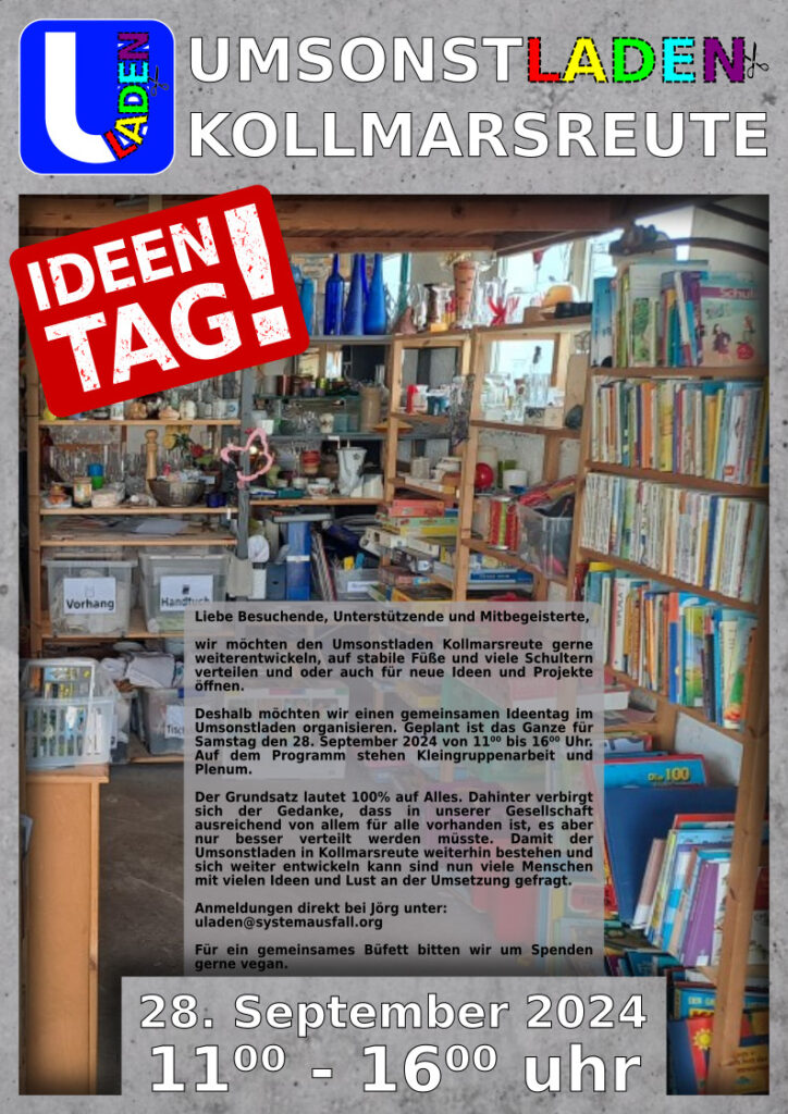 Deshalb möchten wir einen gemeinsamen Ideentag im Umsonstladen organisieren. Geplant ist das Ganze für Samstag den 28. September 2024 von 11⁰⁰ bis 16⁰⁰ Uhr. Auf dem Programm stehen Kleingruppenarbeit und Plenum.