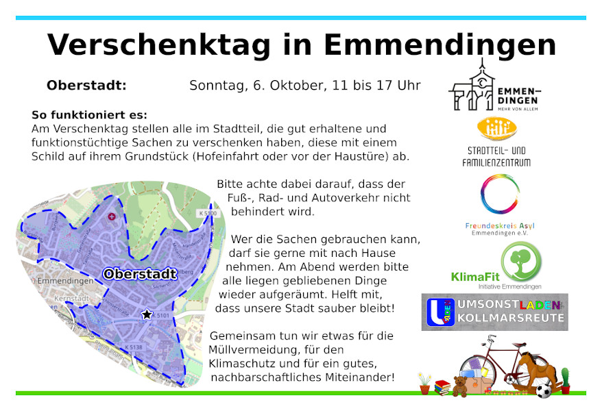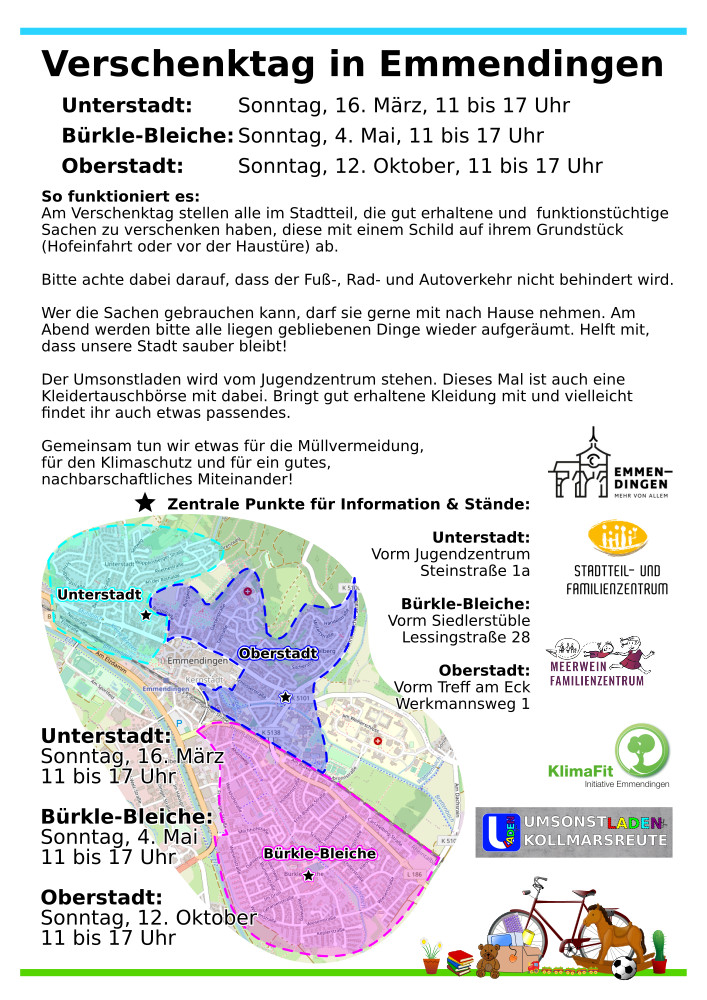 Wie schon in den letzten 2 Jahren veranstalten der Umsonstladen Kollmarsreute, die Klimafit Initiative Emmendingen und die Familienzentren der Stadt Emmendingen auch dieses Jahr wieder Verschenktage – in der Unterstadt (16.3.), Bürkle-Bleiche/Ramiegelände (4.5.) und der Oberstadt (12.10.).