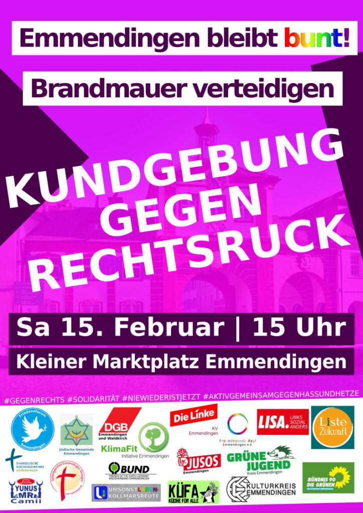 Kundgebung gegen den Rechtsruck in Politik und Gesellschaft Samstag den 15.02.2025 um 15.00 Uhr Auf dem kleinen Marktplatz in Emmendingen