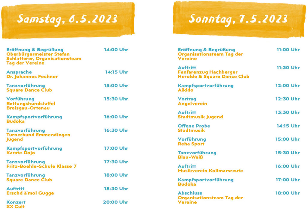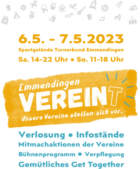 Vom 6. bis 7. Mai 2023 findet eine großes Fest für jung und alt auf dem Sportgelände vom Turnerbund Emmendingen statt. Da in der Pandemie viele Menschen auseinander gegangen sind und zahlreiche Aktionen eingeschlafen sind, zeigt jetzt Emmendingen wie vielfältig und aktiv unsere Stadt doch ist. Etwa 40 Vereine stellen sich vor und zeigen was wir in Emmendingen alles erleben können.