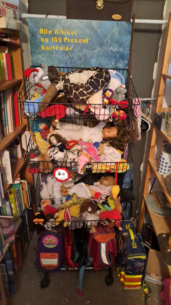 Seit der Sommerpause ist der Umsonstladen wieder auf Hochbetrieb. Wir bekommen so viele tolle Dinge von unglaublich vielen Menschen. Es kommen auch immer wieder neue Leute. Viele die den Umsonstladen noch nicht kennen wollen sich erst einmal ein Bild machen was es gibt und was sie abgeben können. Bei uns ist es leider schon so weit, das wir Kleidung und Bücher nicht mehr sehen können. Auch unser Platz dafür platzt aus allen Nähten. Also wenn ihr Einrichtungen oder Projekte kennt die Kleidung oder Bücher gebrauchen können, sagt uns bitte Bescheid.