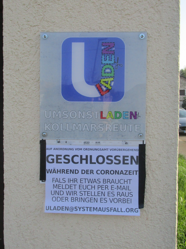 Trotz der Auflage, dass nur 1 Person in den Laden darf, hat das Ordnungsamt heute beschlossen den Umsonstladen in Kollmarsreute vorübergehend zu schließen. Obwohl es auch Lebensmittel im Umsonstladen gibt und diese zur Grundversorgung gehören.