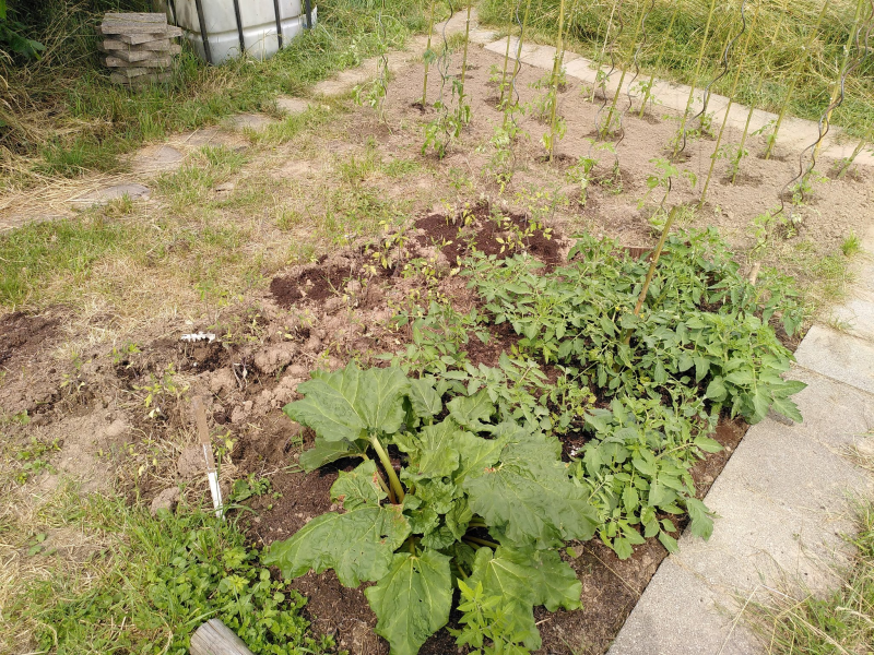 Aber nicht nur Tomaten wachsen hier. Der Rhabarber hat sich auch gut entwickelt. Der Kirschbaum trägt das erste mal schöne süße Früchte und die Himbeeren kommen auch so langsam. Im Gras haben sich auch noch kleine wilde Erdbeeren versteckt. Die Äste der Apfelbäume sind auch schwer behängt mit Äpfeln und der Haselnussstrauch zeigt auch schon gute Ernte für den Herbst. Seit neustem haben sich auch kleine Kohlrabipflänzchen in den Garten verirrt. Wer noch mithelfen möchte oder auch noch Pflanzen hat die eine neues Zuhause brauchen, darf sich gerne bei uns melden.