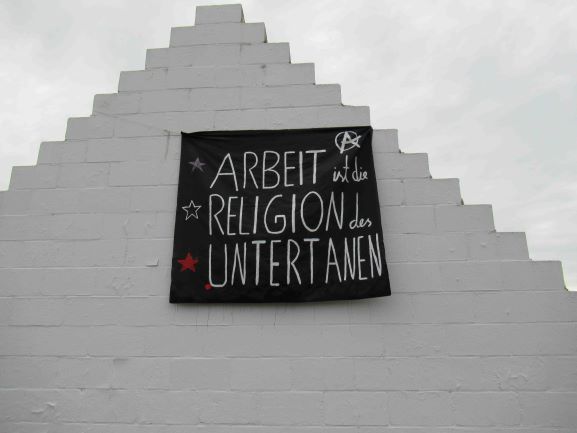 Insofern gilt es, nicht mehr dem Arbeitsethos zu frönen, sich und die Umwelt nicht kaputt zu arbeiten, überhaupt so wenig wie möglich oder gar nicht zu arbeiten und den Wert eines Menschen, nicht nach seiner Arbeit oder Nicht-Arbeit zu bestimmen. Sondern sich mit anderen selbstbestimmt zum Zwecke der Bedürfnisbefriedigung zusammenzutun und Keimformen für eine sich befreiende Gesellschaft aufzubauen: Hausprojekte, Netzwerke gegenseitiger Hilfe, Wagenburgen, Gemeinschaftsküchen, DIY Do it yourself, Kleiderpartys, Freie Lizenzen, Utopien denken, wagen, Reparatur-Initiativen, Lebensmittel retten, vegan leben, selbstorganisierte Basisgruppen, solidarische oder gar nicht-kommerzielle Landwirtschaft, kollektive Betriebe, die nicht für in Geld gemessenen Bedarf, sondern für unsere Bedürfnisse produzieren, und das alles nicht auf Kosten anderer … und Widerstand gegen die patriarchalen, technologischen Angriffe und Zerstörungen zu leisten.