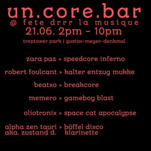 rather spontaneously we decided to take part in the ‚fete de la musique‘. we went with dpwnload’s soundsystem to the treptower park. robert foulcant opened the event, dpwnload & mister kowi followed. for a while, and longer than i expected, we could celebrate the music there. but when zara paz played, the park rangers came and sent us away. we found another place and were able to party some more, but then the park rangers stopped us and forced us to stop when zustand d. started to play. after a while we went to the train station where there is a small tunnel on the side. on the way to the tunnel and in it we continued our little party until it was late. oliotronix and memero sweetened our way to the station and the time in the tunnel.