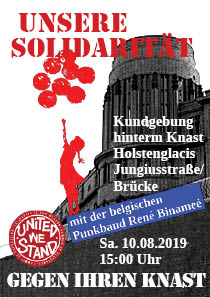 Knastkonzert und Kundgebung hinterm Knast auf der Jungiusbrücke am Samstag 10.8.19, 15.00 Uhr. Es spielt die belgische Punkband René Binameé (Anarcho-Punk, französische Chansons).