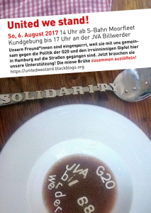 Komm mit uns am Sonntag den 6. August 2017 um 14.00 Uhr zum S-Bahnhof Billwerder-Moorfleet und geh mit uns gemeinsam zur JVA Billwerder die No G20 Gefangenen besuchen! Es gibt Kaffee und Kuchen, Open Mic, gute Musik und noch bessere Wortbeiträge.