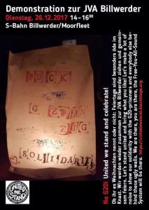 .Ob ihr es Weihnachten nennt oder nicht. Feiertage sind besonders öde im Knast. Wir werden wieder zusammen zur JVA Billwerder ziehen und gemeinsam mit unseren NoG20 Freunden feiern. Wir machen unsere „Autonome Kaffeefahrt“ am 2. Feiertag zum Knast, um den Gefangenen auch jetzt unsere Solidarität zu bringen, musikalische Plätzchen, Obst und Nüsse. Von der feinen Sorte! Wegen Winter, kalt und dreckig, dieses mal nur 2 Stunden, aber mit Power durch die Mauer! Kommt mit, bringt mit, nehmt mit!