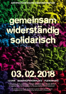 Es kann nur eine Selbstverständlichkeit sein, sich gegen diese menschenfeindliche Partei, gegen den Rechtsruck und die nationalistische Formierung in der Gesellschaft zu erheben. Rechtspopulist_innen dürfen in Flensburg, in Schleswig-Holstein, in Deutschland und weltweit zu keiner Macht gelangen. Nur durch einen Kampf gegen die Faschisten kann der Faschismus verhindert werden. Dies muss unser aller Aufgabe sein.