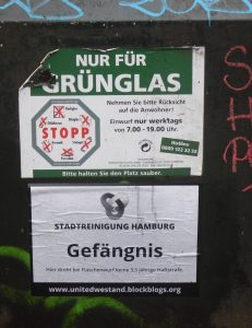 Am Wochenende wurden an zahlreichen Altglascontainern Plakate mit Bezug auf die Verurteilung von Aktivist*innen aufgehängt. Der Slogan „Flaschenwurf – Hier drohen keine 3,5 Jahre Gefängnis!“