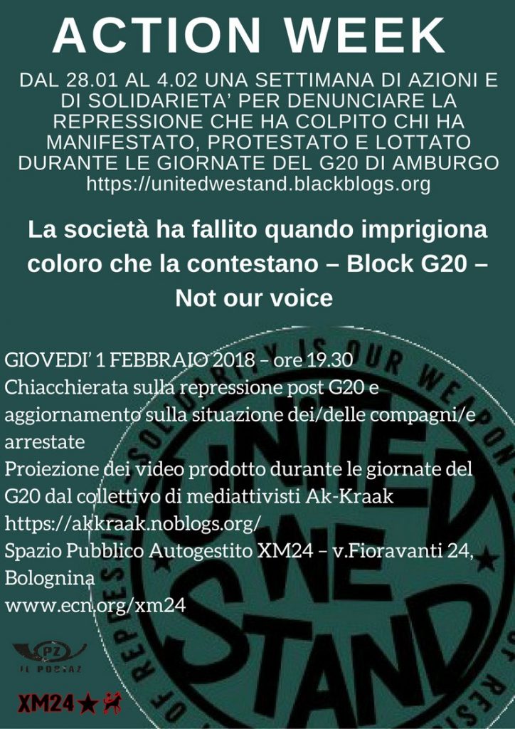 La campagna „United we stand“ essere costituito da diversi gruppi e le persone single per sostinere e organizzare la massima solidarietà e il massimo supporto per tutte le persone che sono colpito da repressione. Daremo la massima importanza a le G20-priogionieri in priogione durante i loro processi.
