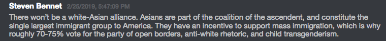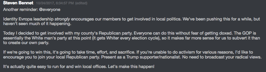As Patrick and his other upper echelon cronies try to keep their brood in check online, he advocates attempts to take over of the Republican party. Identity Evropa’s relatively clean-cut optics and ethnic nationalism poise them to potentially be a radical faction of the GOP, pushing policies and ideologies akin to that of Stephen Miller, Trump’s current senior policy advisor.
