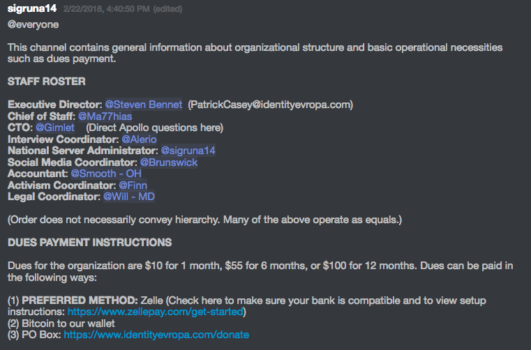Casey and other IE leadership have been concerned about the group’s ongoing legal battle stemming from the Unite the Right rally in 2017 and its immense financial consequences. In several posts on their Discord sever, Casey pleads with members to not only pay dues but also get donations flowing to up to $2,800 per month to their legal defense. These researchers wonder if Casey and Rubicon Holdings are really operating their business in a legal manner, “legality” being a pillar of Casey’s vision for IE, especially as they continue to fleece their members going into their 2019 conference.