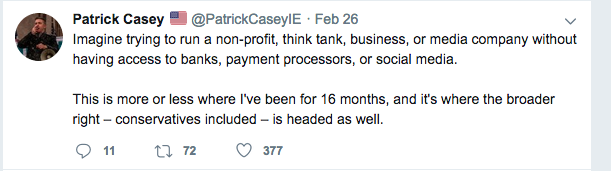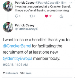IE pushes white nationalist propaganda activism (largely stickers and banner drops) to the forefront while trying to keep their true racist separatist values under wraps until they have a hold on some sort of social or political power. Patrick himself was blocked from attending the Conservative Political Action Convention (CPAC) in 2019, however, he still managed to host other “fringe conservatives” in his suite at the Gaylord, the same hotel CPAC was being held at.
